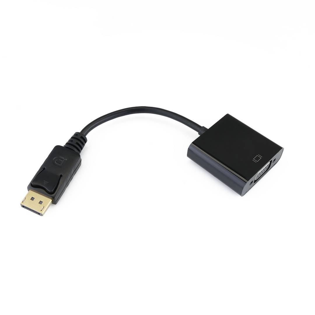 Small DisplayPort to VGA converter. On one side it has a DisplayPort Male connector and on the other side HD15 Female. This allows to use VGA monitors with computers or video sources that have a DisplayPort output. The internal electronics performs the conversion without the need for special controllers or power supply.