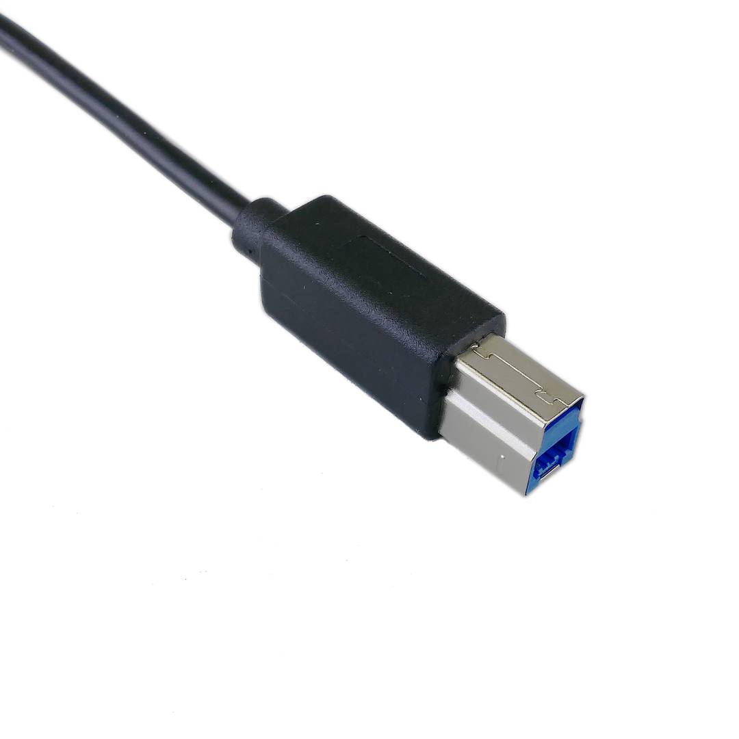 USB cable that has a reversible USB type C 3.0 male connector at one end and a type B 3.0 male USB connector at the other end.