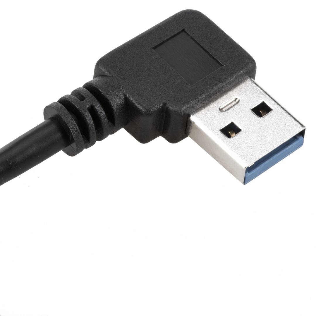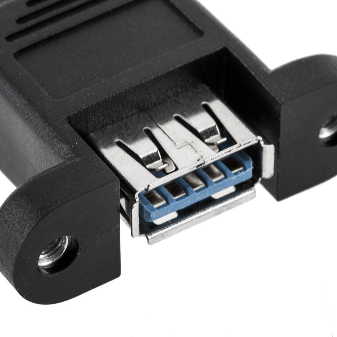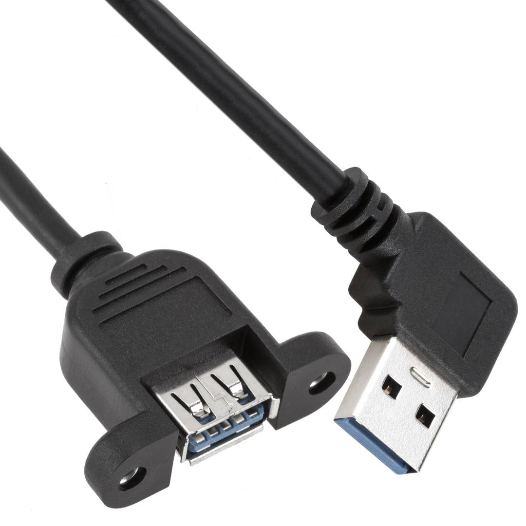 0.5m,1m,2m long USB 3.0 adapter cable that has an angled USB A-Male connector (90 degrees) at one end and a USB A-Female connector at the other end. The USB A-Female connector is prepared to be installed on a plate or in a specific socket in a metal box.