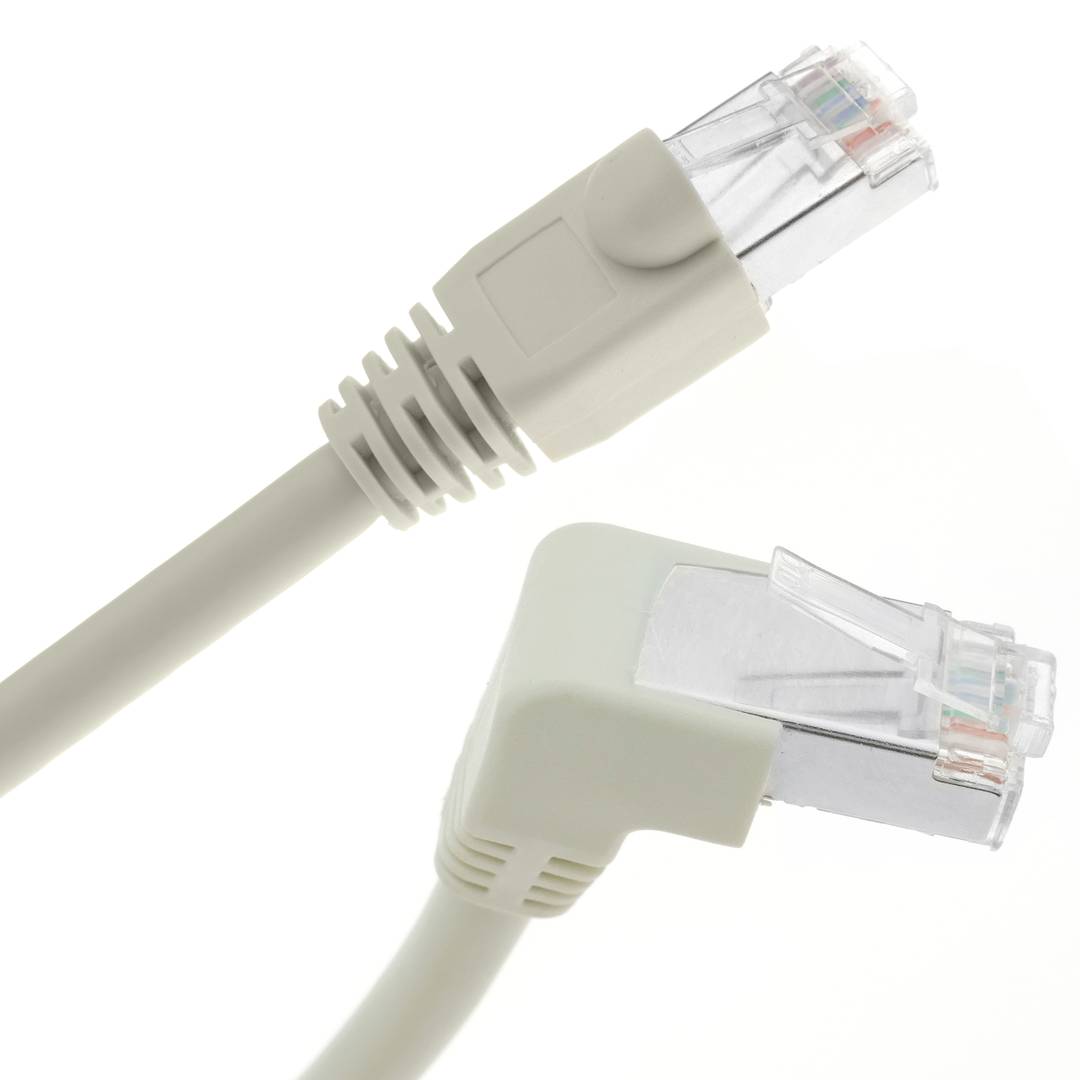 Network cable that has an angled male RJ45 connector at one end (90 degree angle). On the other end RJ45 straight male connector.
